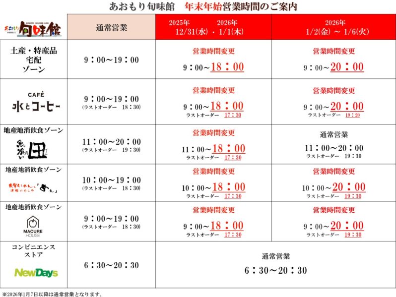 2025年-2026年度 年末年始営業時間のお知らせ【あおもり旬味館】