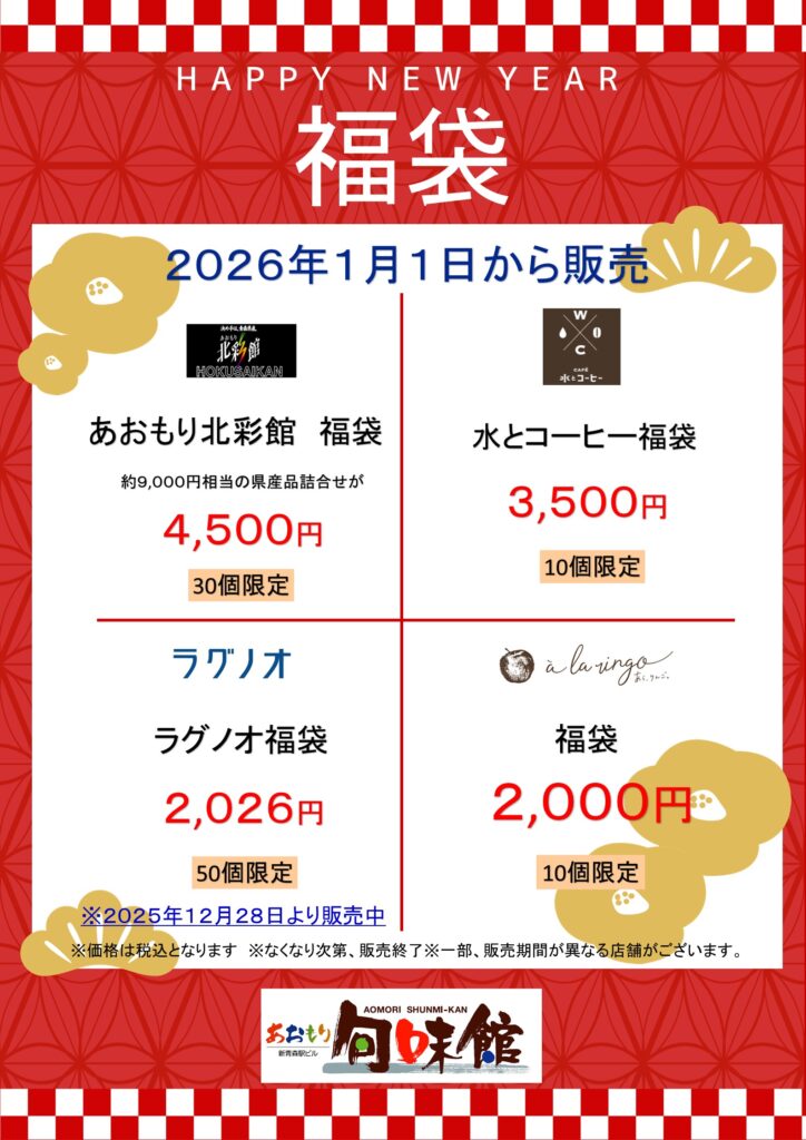 TOP イベント・キャンペーン ショップガイド フロアガイド 施設案内 決済方法 アクセス・駐車場 免税対象店舗 求人情報 お知らせ お問い合わせ 会社案内 個人情報の保護について JR東日本グループコンプライアンス相談窓口 ウェブサイトのご利用について ソーシャルメディアポリシー ホーム イベント・キャンペーン ≪終了≫2026年あおもり旬味館_福袋情報!【1/1~】 ≪終了≫2026年あおもり旬味館_福袋情報!【1/1~】 2025/12/30(火) キャンペーン 2026年1月1日から販売! あおもり旬味館 福袋情報を お知らせいたします✨ 是非この機会に、あおもり旬味館へお越しくださいませ♪ 一覧へ
